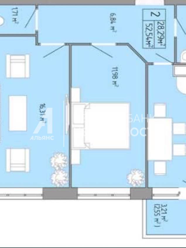 Загальна площа 54,6 кв. Нині вона 2-х кімнатна. Але можна прибрати стіни і зробити більше кухню та більше одну кімнату. У квартирі є 2 САНУЗЛА! Або можна зробити один і другий використовувати як комору.