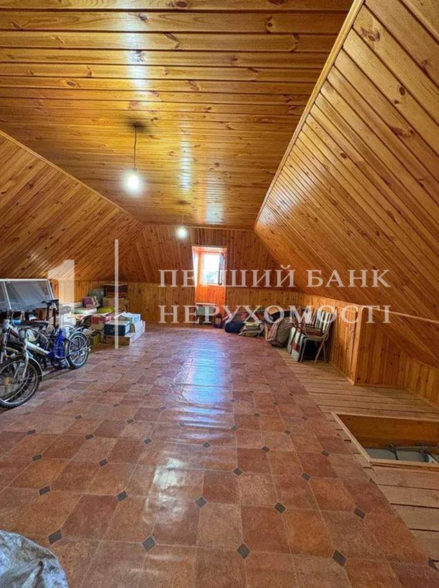 Мансарда: утеплений простір 70 м², обшитий деревом, з коморами – ідеально під більярдну або кабінет.