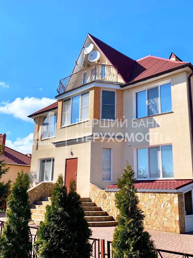 Ділянка 6,5 соток, 312 (м2), 4 рівні, 2 поверхи, підвал під усім будинком, 6 кімнат, кухня, 3 з/в, зимовий сад, сауна, гараж на 3 машини. Усі комунікації. У дворі ландшафтний дизайн, сад із хвойних дерев, великий двір для машин, альтанка з барбекю + коптильня, зона з шезлонгами, басейн із протитечією. Опалення самостійне (не залежить від світла). Затишний будинок для життя та відпочинку