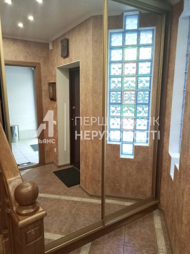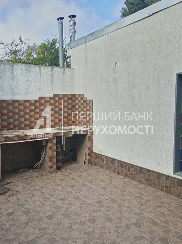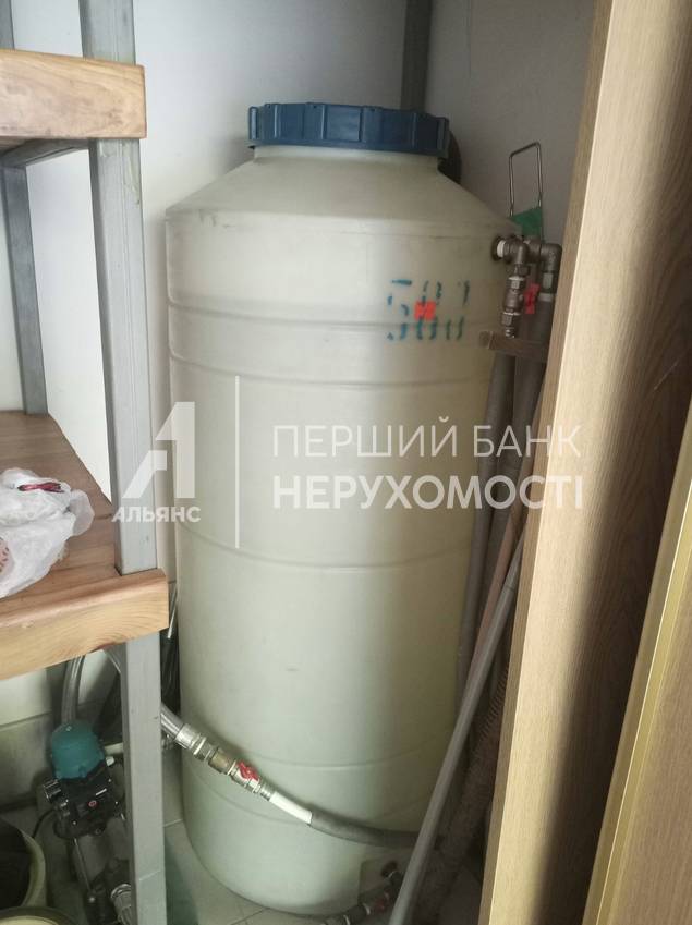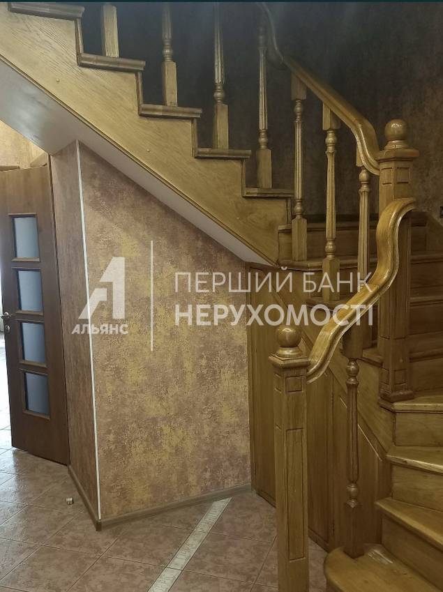 На першому поверсі розташований гараж площею 17 квадратних метрів із ємністю для води, простора кухня площею 27 квадратних метрів із виходом у альтанку, де знаходиться додатковий мангал. Дерев'яні дубові сходи ведуть на другий поверх.