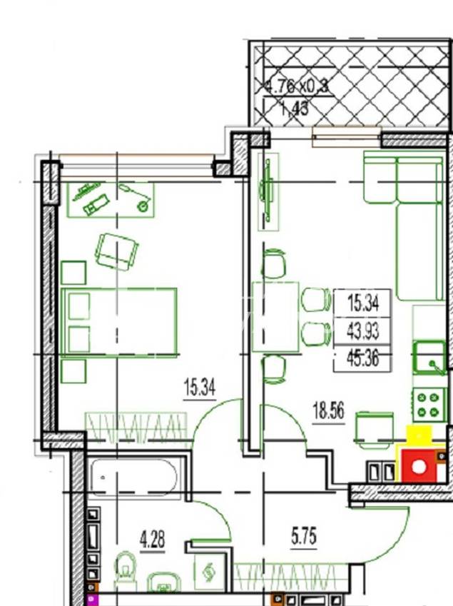 | Жила/Кухня, кв.м. | 15.34/18.56 | ||