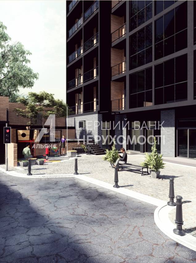 У дворі житлового комплексу розмістять зручні парковки, сучасні безпечні дитячі майданчики та пішохідні доріжки з лавками для відпочинку.