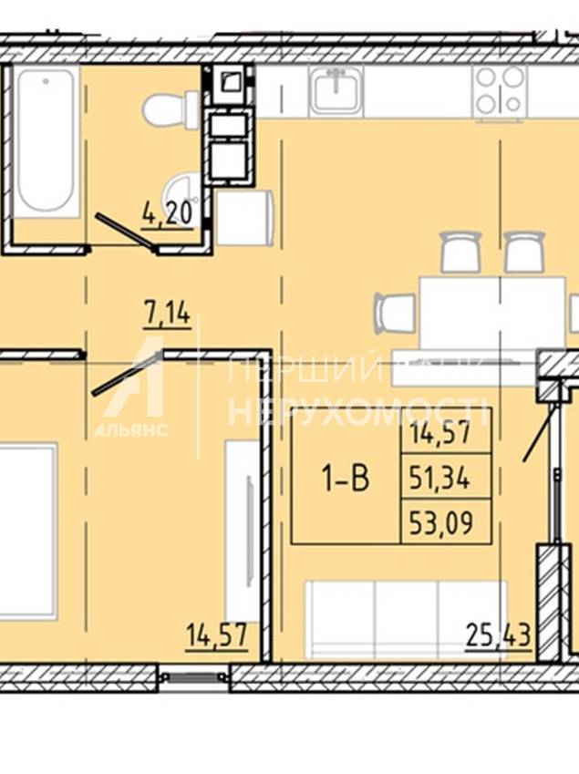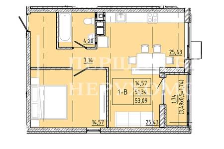 | Жила/Кухня, кв.м. | 14.57/25.43 | ||