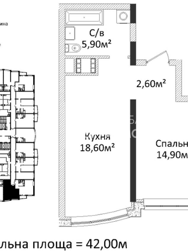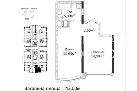 Квартира 42,1 м.кв, кухня-студія та спальня, з/в - ванна.