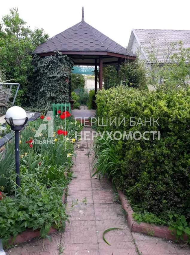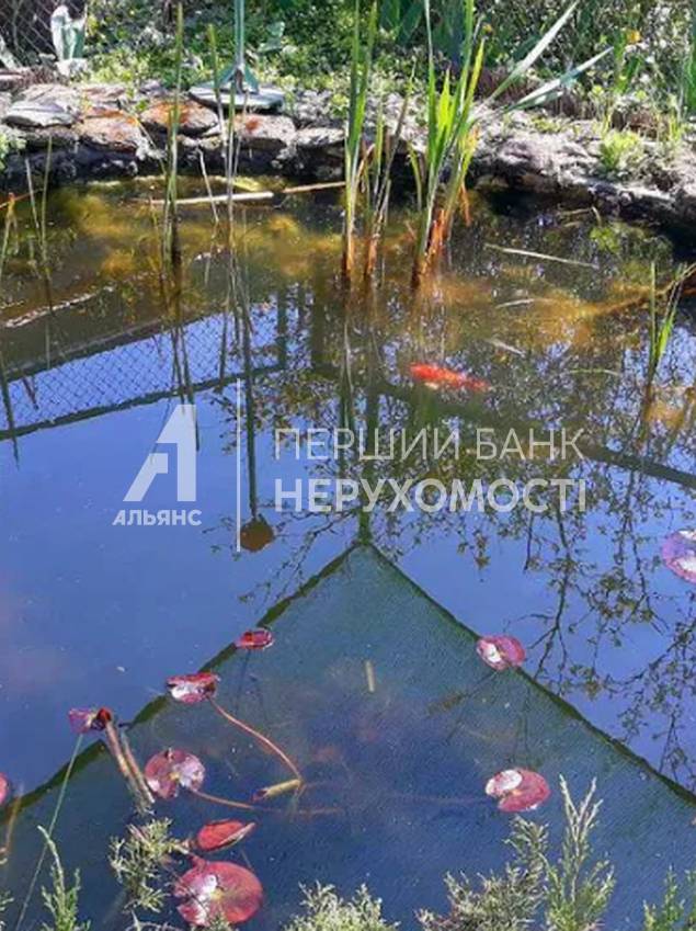 Сад, беседка с прудом. Для авто установлен крытый навес из поликарбоната. Есть вольер для собаки- 6 м2.