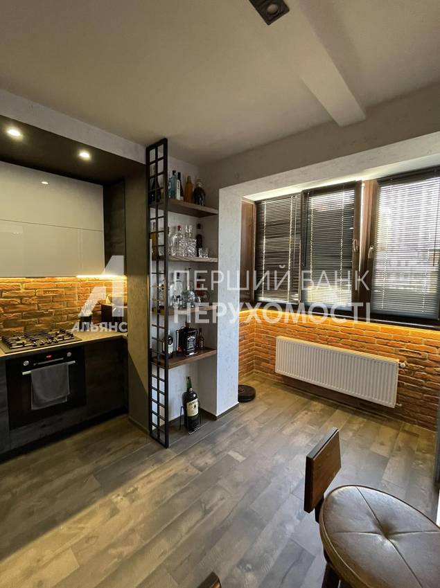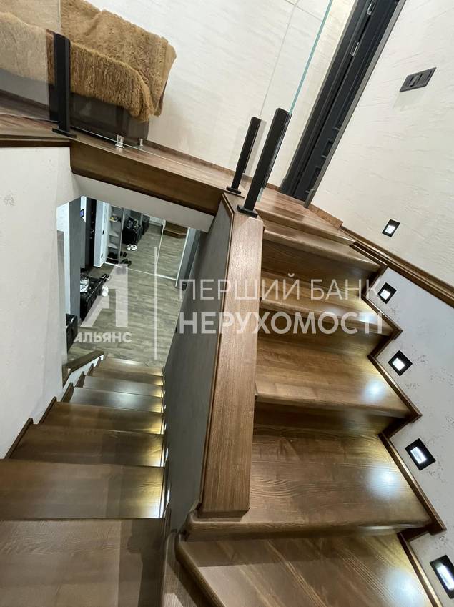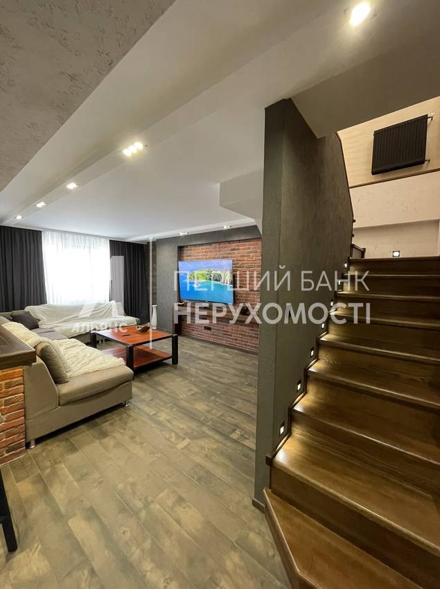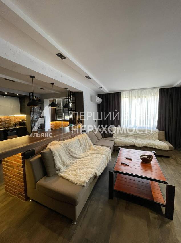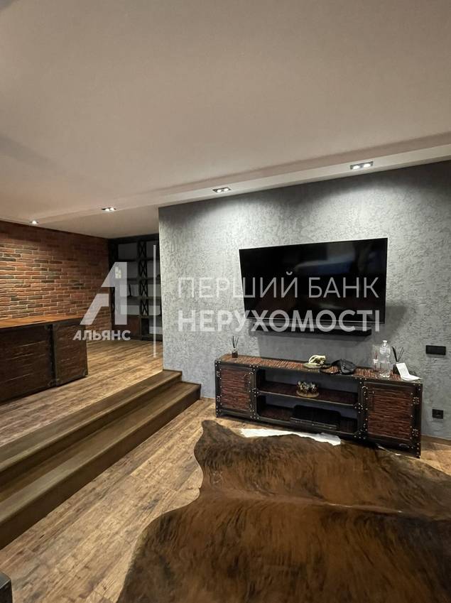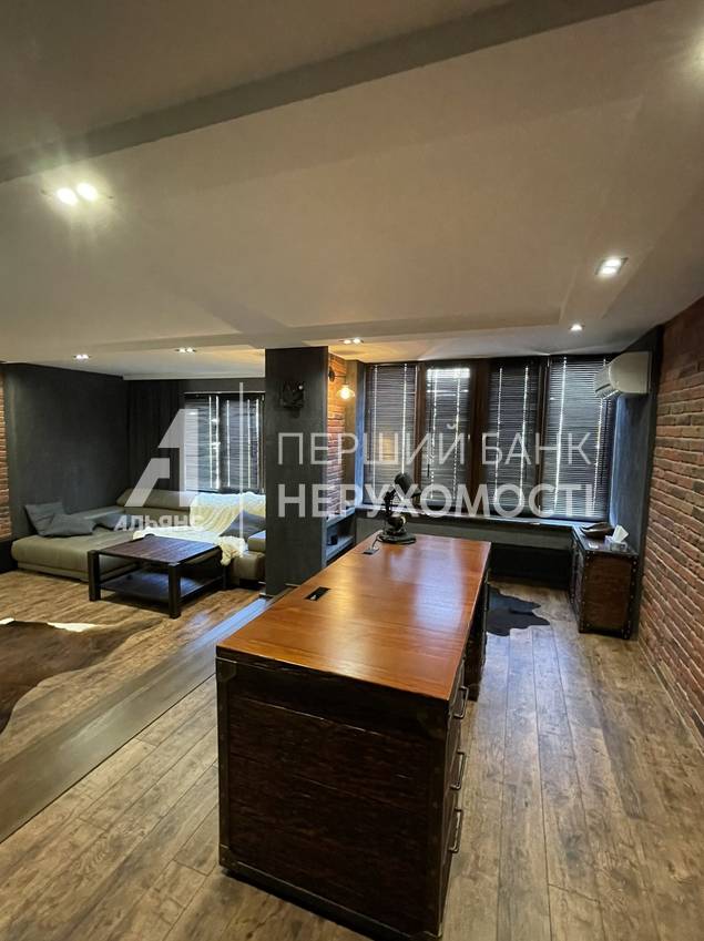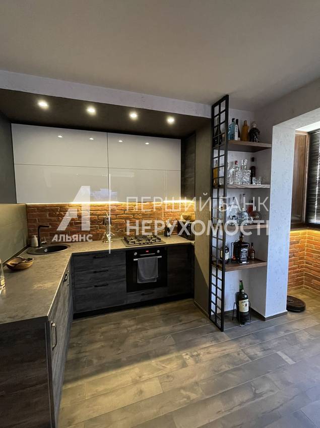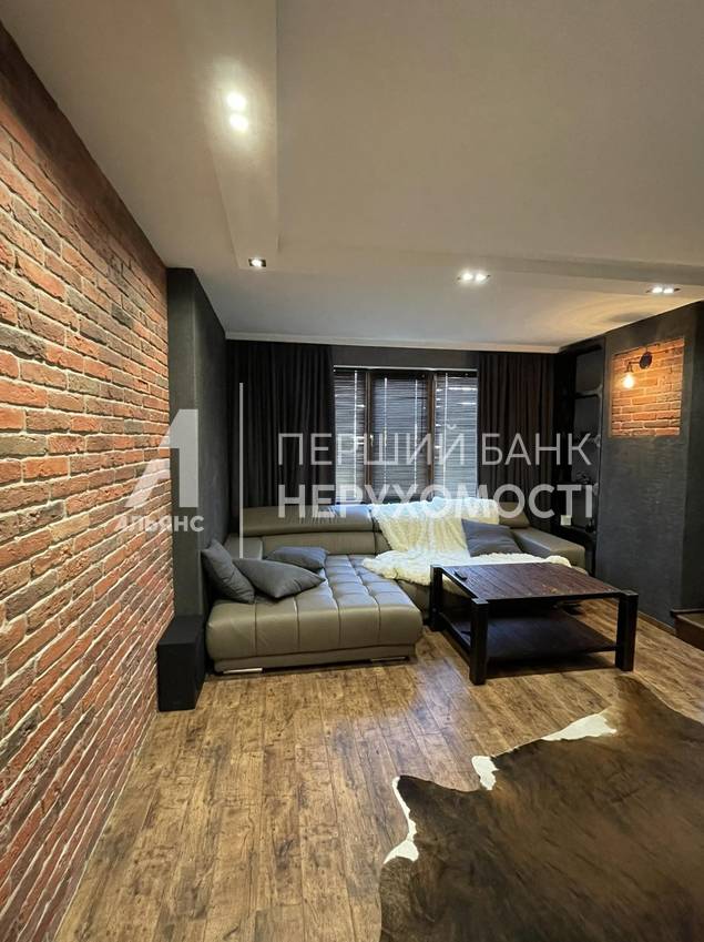 На первом уровне - кухня-гостиная, площадью 60 кв. м. , санузел, подсобное помещение. На втором уровне: две спальни, выход на лоджию, просторный санузел и гордость хозяина - брутальный кабинет!