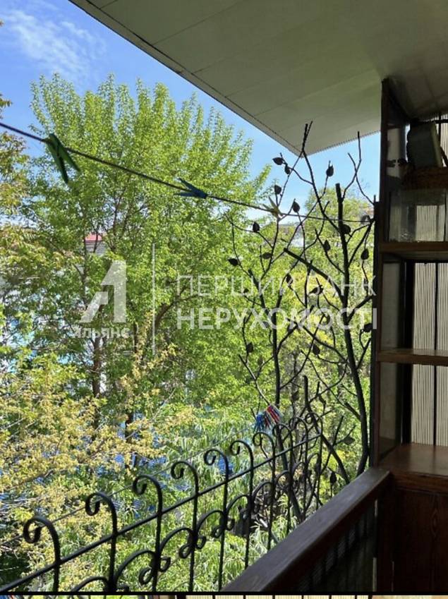 Балкон выходит в тихий красивый двор, с деревьями , цветами.