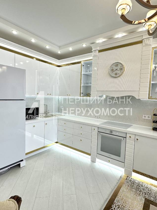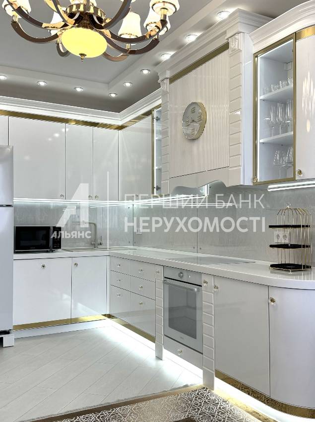 Кухня сделана под заказ с авторскими элементами декора, мебельная фурнитура с доводчиками BLUM, посудомоечная машина Bosch , индукционная варочная поверхность gorenje , духовой шкаф gorenje , холодильник Samsung шириной 76см. с вместительной морозильной камерой, система очистки воды- Ecosoft. На случай отключения подачи горячей воды предусмотрены 2 бойлера.