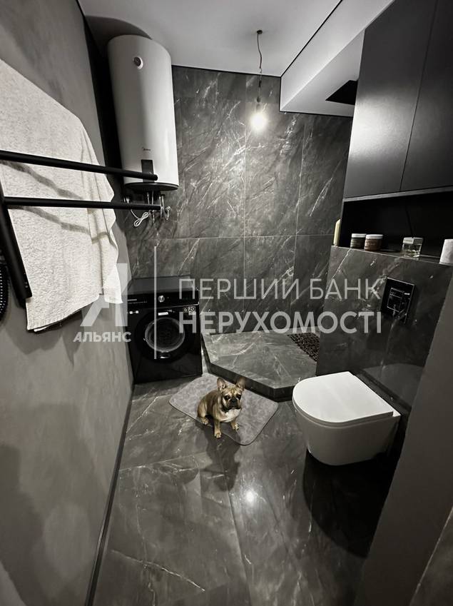 2. Душевая с тропическим и ручным душем, бойлером на 100л, подвесным унитазом, стиральной машиной и глубокими шкафами