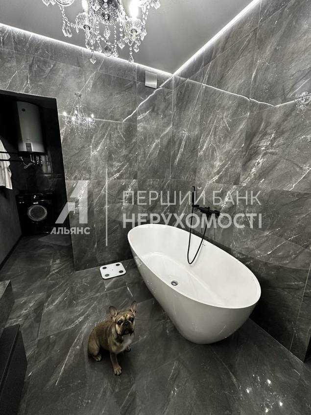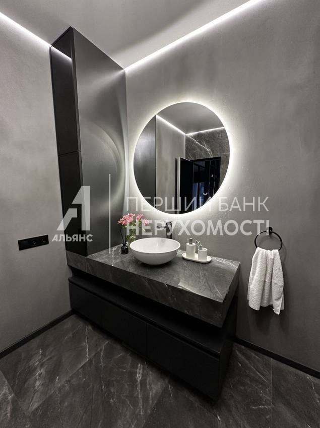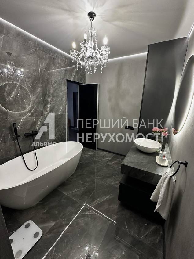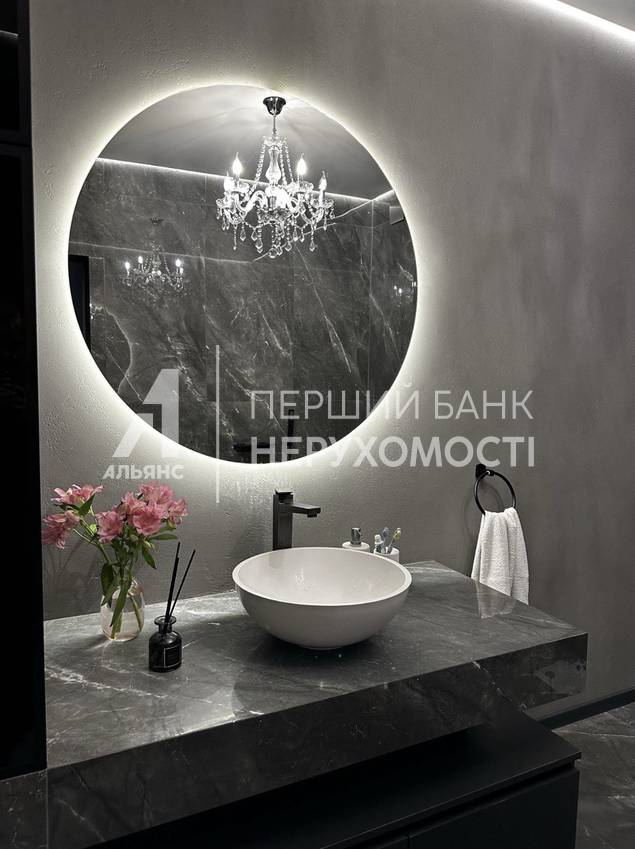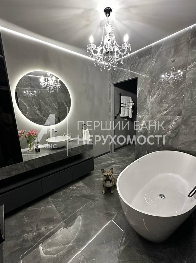 1. Умывальник со шкафами и большой ванной из искусственного камня (140 кг) и шикарной люстрой и эргономичной корпусной мебелью и круглым зеркалом с подсветкой