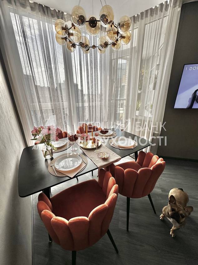 Обеденный стол + 4 стулья итальянского бренда Carveli под большой яркой люстрой сделает вечера особенными Телевизор диагональ 55