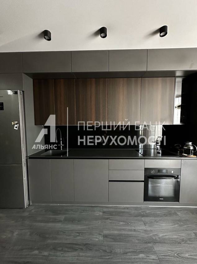 Кухонная мебель изготовлена на заказ, фасад из итальянского пластика, встроенная техника Samsung (холодильник с морозильной камерой, индукционная плита, духовая шкафа)
