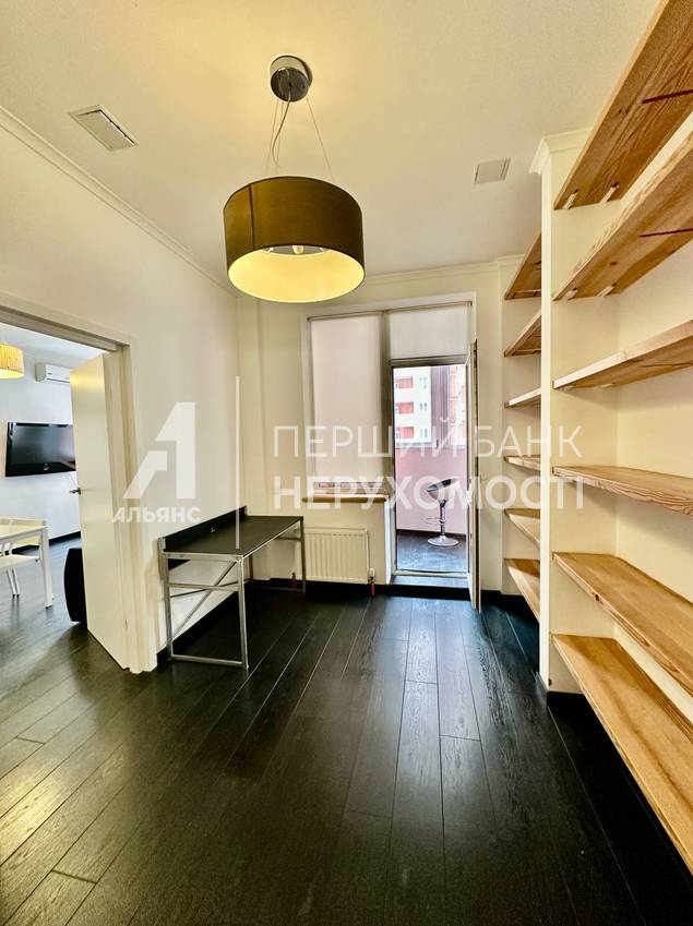 квартира распланирована в кухню-студию, спальню, гардеробную и санузел. Есть застекленная лоджия