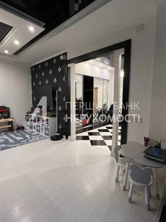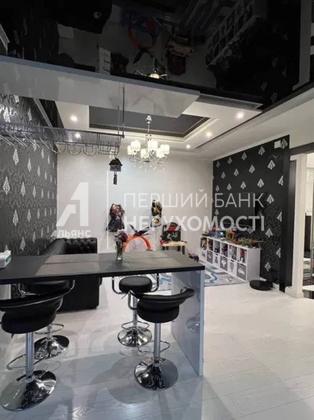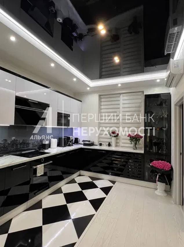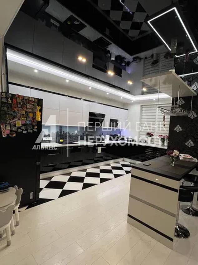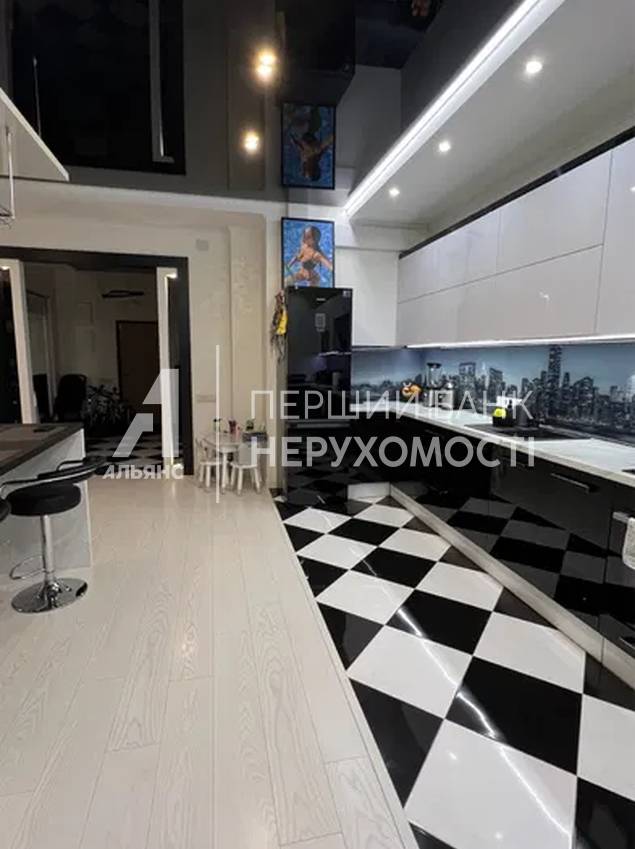 Кухня-гостиная 32 м² — центральное пространство квартиры. Кухня выполнена на заказ с фурнитурой Blum, встроенной техникой Bosch, Samsung и Whirlpool. Продуманные сценарии освещения, натяжные потолки, декоративная штукатурка, дизайнерские обои. В гостиной — уютная ТВ-зона с кожаным диваном.